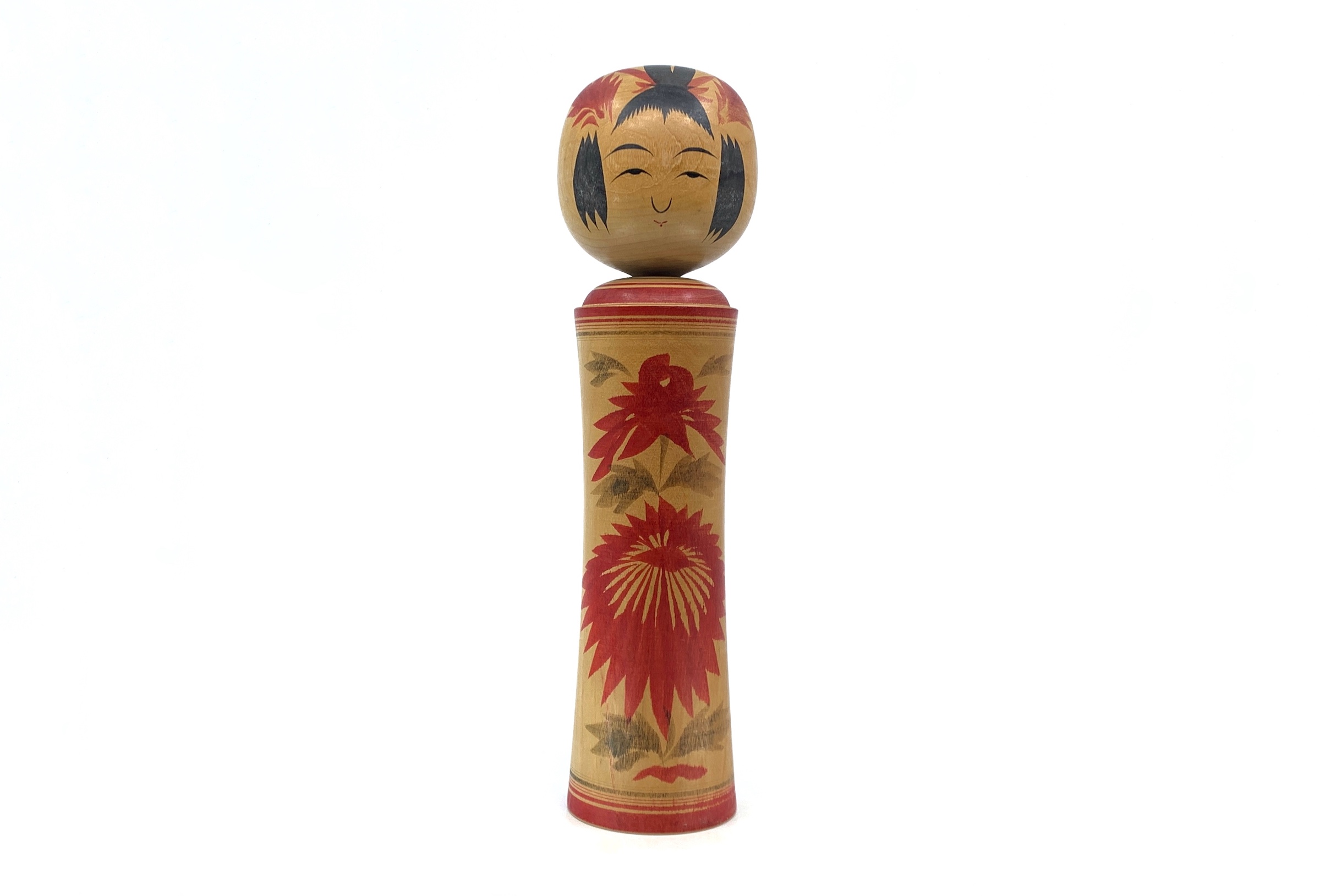 Identificare le Kokeshi può essere difficile, ma partiamo dalle basi! Il Naruko è lo stile più riconosciuto per le kokeshi ed ha molta influenza sugli altri tipi. Si distingue per il corpo dritto, che si restringe leggermente in vita, con dipinti di crisantemo, iris o peonia. I capelli sono legati con nastri rossi, le spalle sono decorate con linee al tornio. Hanno naso da gatto, palpebra singola e labbra rosse.